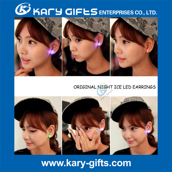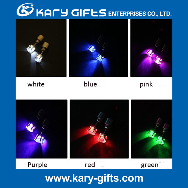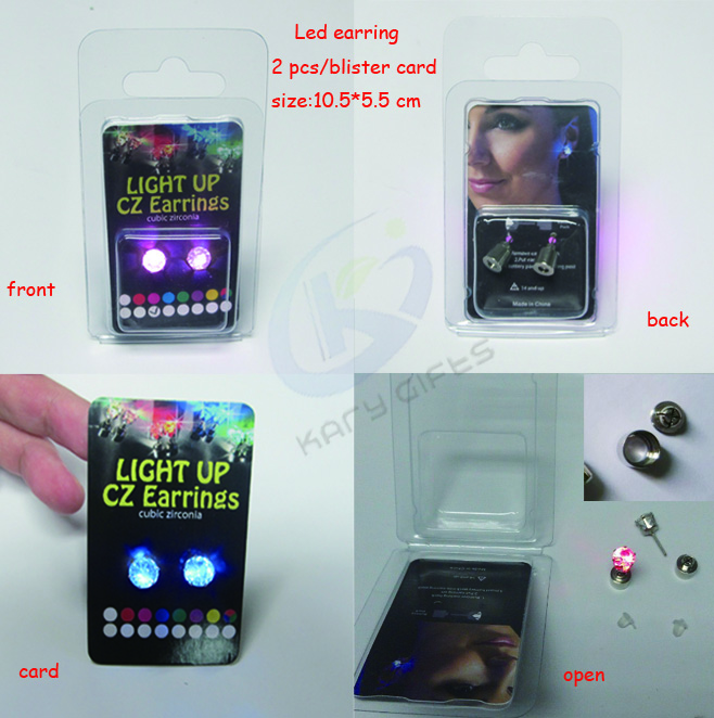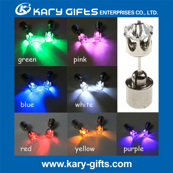 This multi color crystal light up led earring made of copper and crystal , with mini cute shape, is powered by 2 pcs cell batteries included in the led shining earring. The copper material allows all people to wear it, no worry it will be allergy. Just snap the crystal party with battery set, it will light on. Take the 2 parts apart, it will light off. This led earrings is really convenient and beautiful to have it. With CE and ROHS certifications, it is supermarket approved high quality. The earrings are really shining, you will be eye-catching and be the charming focus. You can also wear it at day time by replace the battery part with the white plastic stud.